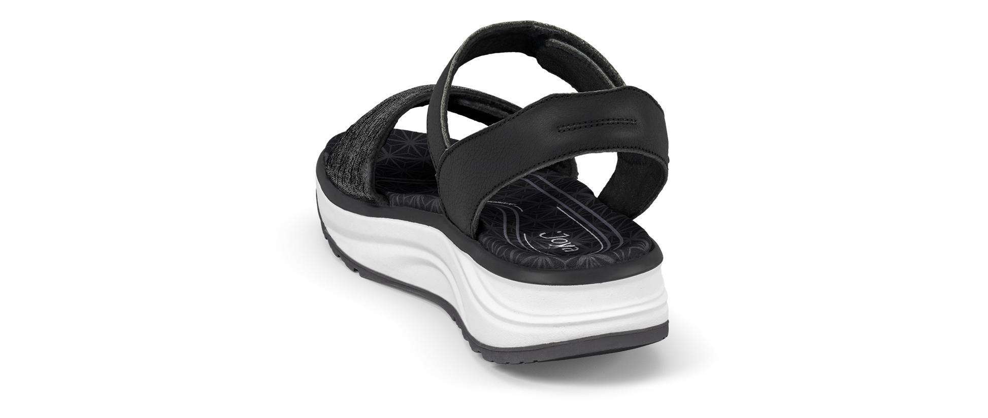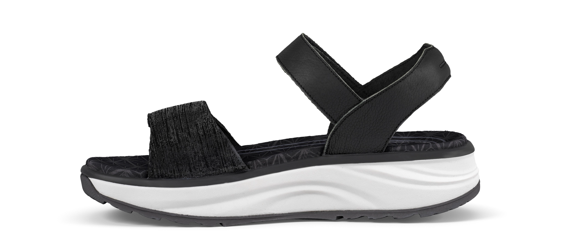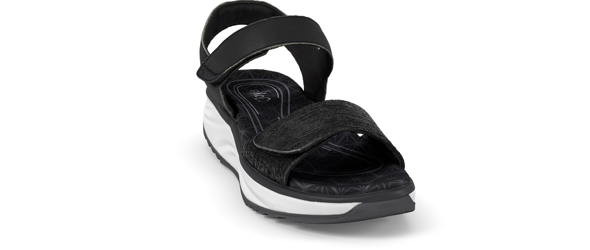 Exquisite full grain leather and sparkling velour leather sandal with adjustable velcro straps on the instep and forefoot. Fitted with an ergonomic footbed wrapped with soft, velvety microfiber. Implemented with the Joya Active sole technology that guarantees an ideal combination of cushioning, rebound and stability. For dynamic people always on the move who need comfort in action and performance on every surface.