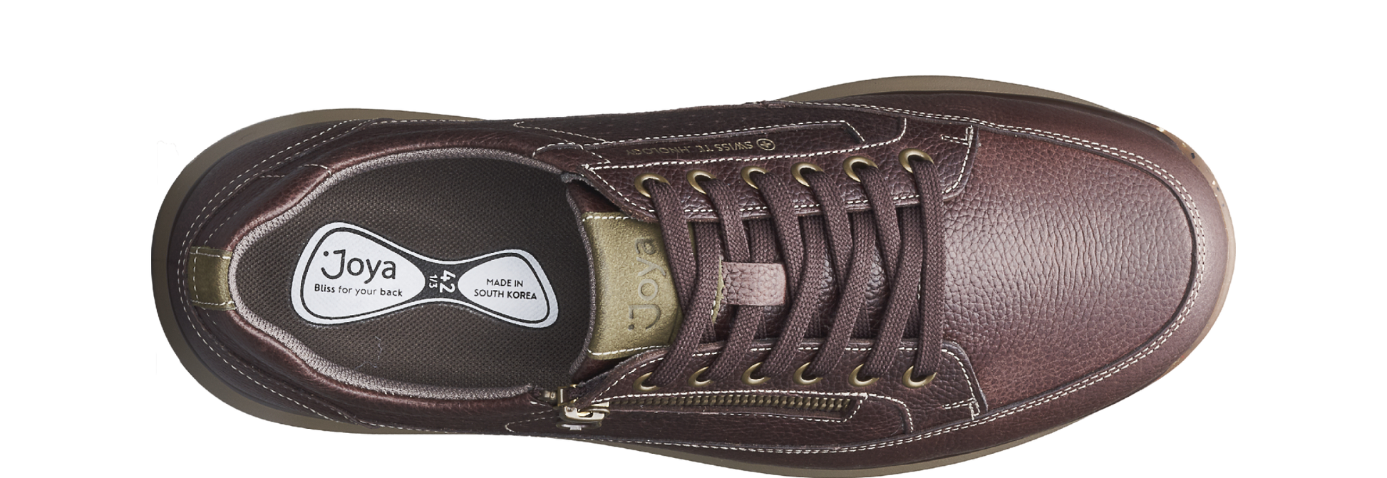 Full grain leather lace up shoe with additional zipper for easy entry, with breathable mesh lining. Featured with the Joya Senso sole technology that ensures excellent cushioning effect and balanced pressure distribution, and delivers optimum comfort and relief for your back muscles, joints and feet daily stress.