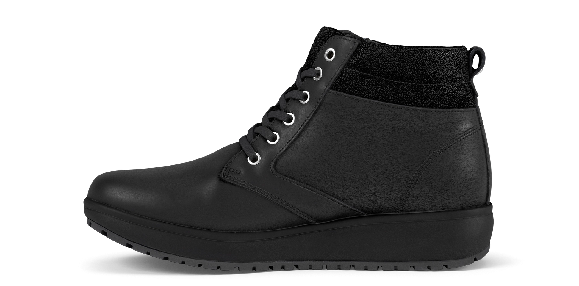 Bottines élégantes à lacets avec fermeture éclair pour un chaussant facile. Tige en cuir pleine fleur souple avec col rembourré en daim brillant et moelleux. Doublure en cuir et textile. Dotée de la technologie de semelle Joya Senso, elle offre un amorti unique qui soulage parfaitement les muscles et les articulations du dos.