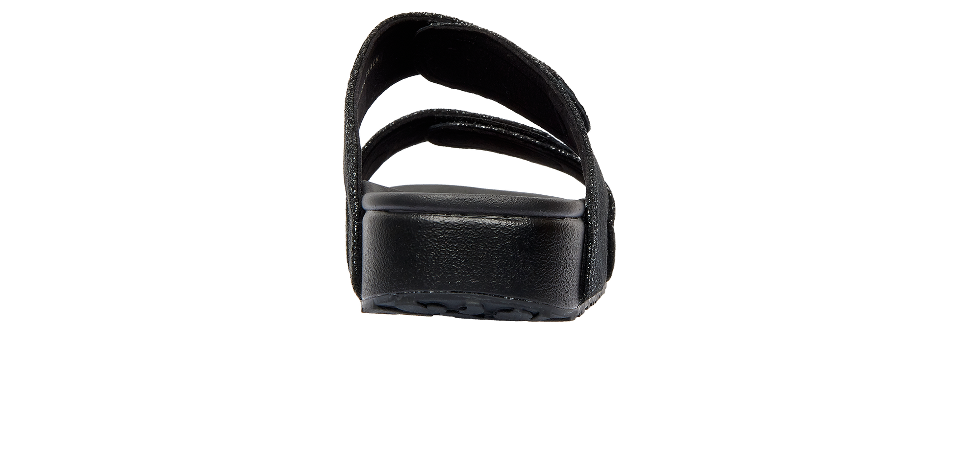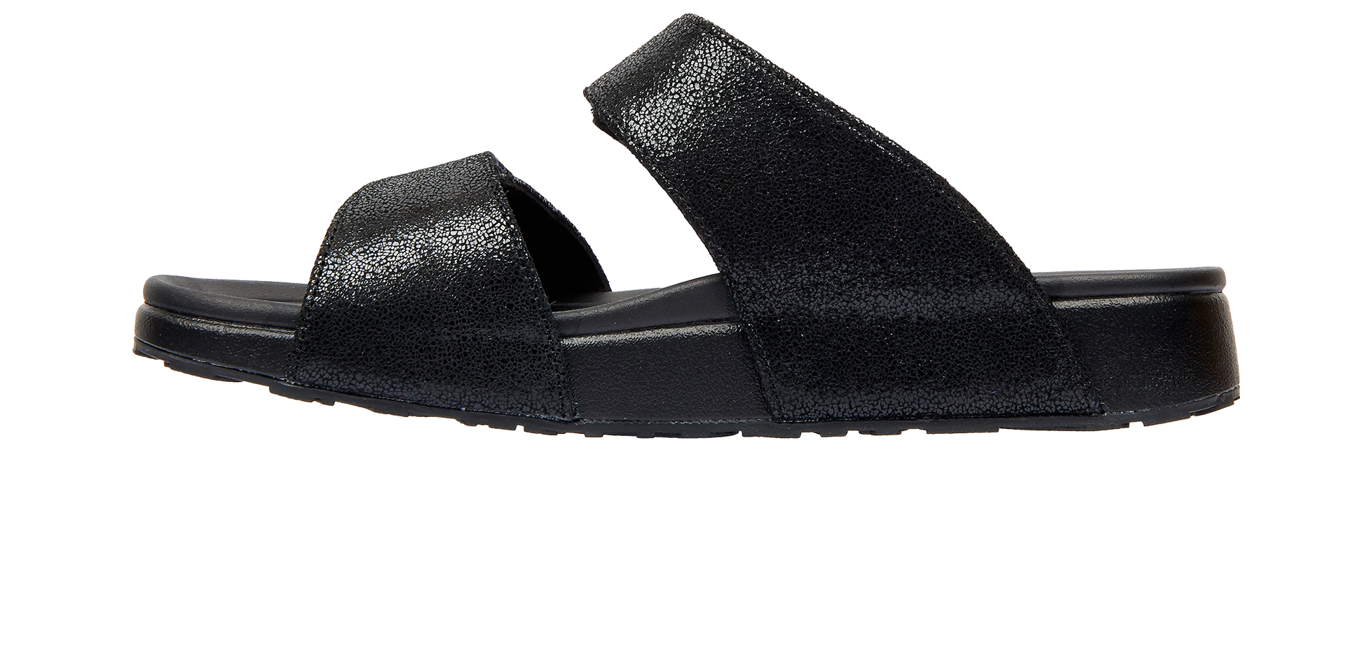 Hausschuhe aus funkelndem Spaltleder und weichem Textilfutter. Verstellbare Klettbänder sorgen für eine optimale Passform. Diese Technologie verfügt über ein weiches Fussbett und eine breite, weiche Sohle, die für Stabilität und Dämpfung sorgt. Geeignet für Menschen mit empfindlichem Rücken und mit Füssen und Gelenken, die täglicher Belastung ausgesetzt sind.